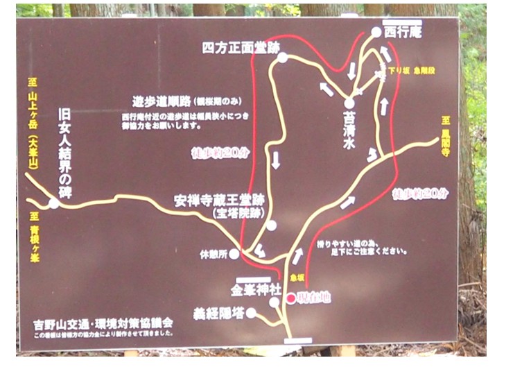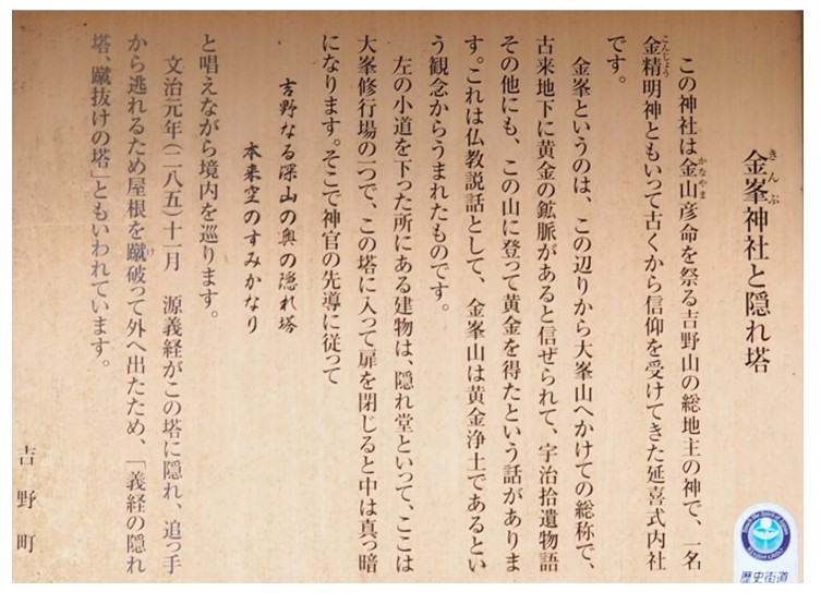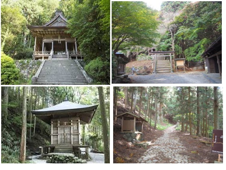 上:金峯神社 下左:義経隠塔(資料より) 下右:西行庵方向への山道