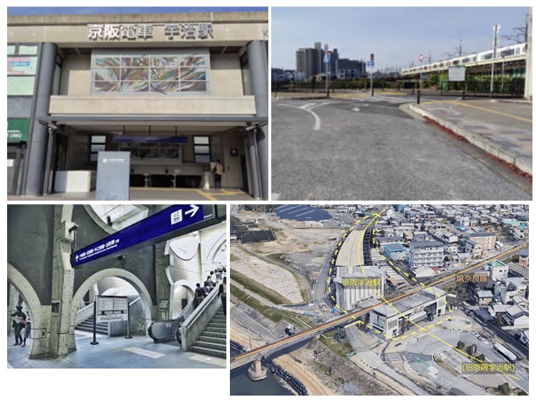 左:京阪宇治駅 右上:駅前 JR線方面 右下:移転前と後の風景
