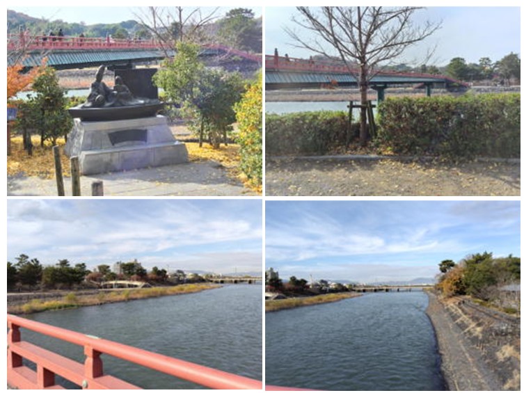 上左:朝霧橋横の源氏物語モニュメント 上右:宇治川沿い 下:朝霧橋から宇治川を見る