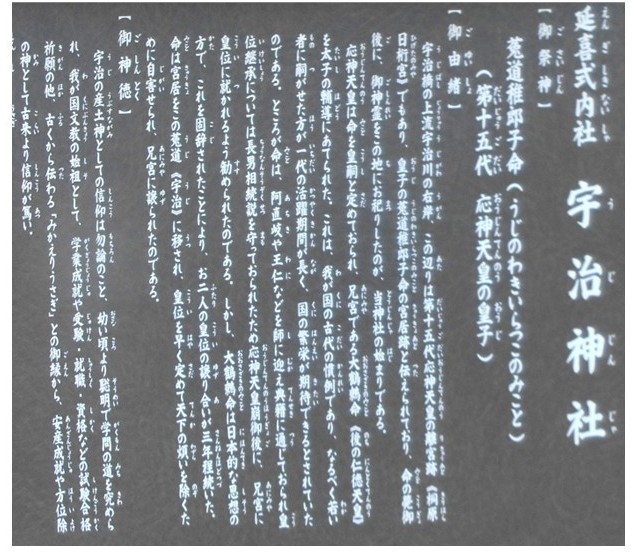 次は隣にある宇治神社に向かう。祭神は菟道稚郎子命(うじのわきいらつこのみこと)で、第15代応神天皇の皇子。