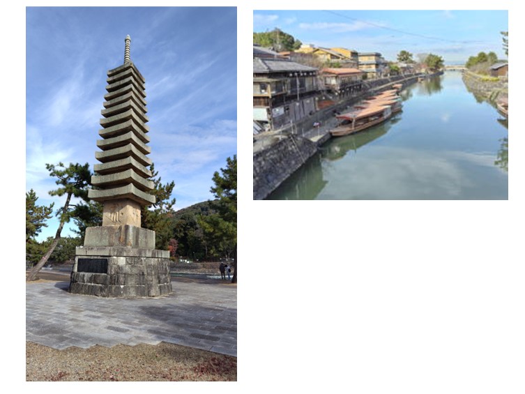 左:十三重石塔 右:鵜飼船の並ぶ乗場